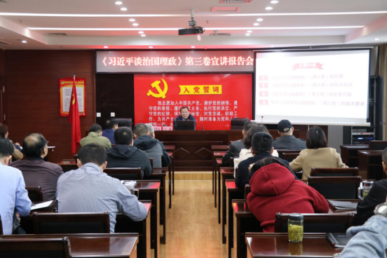 市委党校副教授丁武同志作《<习近平谈治国理政>第三卷宣讲报告》,剖析了《习近平谈治国理政》第三卷的时代背景,深刻阐述了《习近平谈治国理政》第三卷的主要内容和基本框架,并就把学习宣传贯彻习近平新时代中国特色社会主义思想不断引向深入提出了方法。