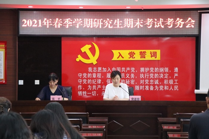 7月9日下午,2021年春季学期在职研究生期末考试考务会在综合楼804会议室召开,校委委员费蕙蓉主持会议。函授部主任张平首先传达了省校2021年在职研究生录取工作及春季学期期末考试考务会精神,并对我校考试安排做出说明。然后,张平主任带领大家学习了新修订的《关于加强在职研究生考务工作纪律的规定》及《监考人员守则》、《考场规则》。最后,校委委员费蕙蓉要求大家高度重视考务工作,提高风险意识,坚守岗位,做好疫情防控,确保期末考试工作顺利进行。