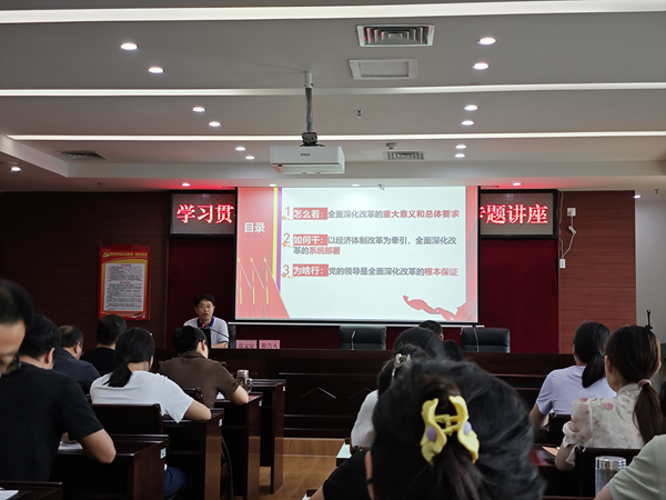 近日,校机关第一党支部召开党员大会。会议邀请马克思主义基本理论教研室主任张文宝教授作专题讲座《进一步全面深化改革开辟中国式现代化广阔前景》。张教授从全面深化改革的重大意义与总体要求、系统部署与根本保证等方面对党的二十届三中全会精神进行了解读。讲座结束后,支部委员苗思琪和张平同志分别传达学习了习近平总书记关于党纪学习教育的重要指示和《中国共产党不合格党员组织处置办法》。最后,各党小组分别推出代表,就学习贯彻党的二十届三中全会精神,结合自身工作实际进行交流发言。